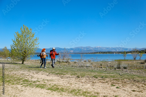 © luisrojasstock, Obraz premium Hikers walking along lake shore with mountain view on sunny day