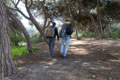 © KONSTANTIN SHISHKIN, Fototapeta premium Hikers walking in a pine forest trail