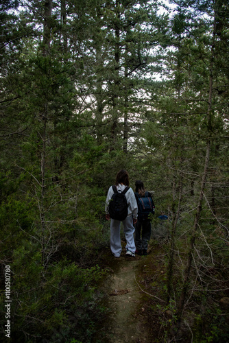 © Michalis Palis, Fototapeta premium Hikers walking on path through lush green forest