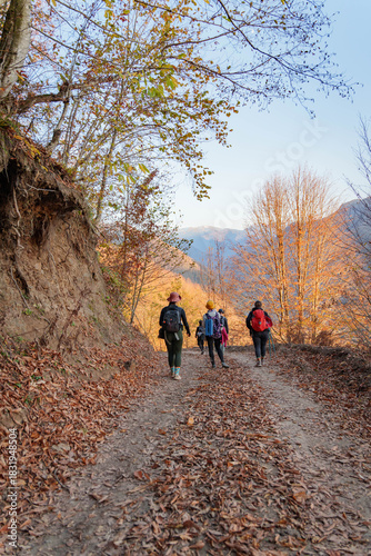 Obraz premium Hikers Walking Through Leafy Forest Trail