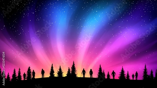 Fototapeta premium Hikers Witnessing Aurora Borealis Night Sky