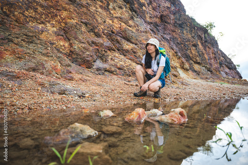 Obraz premium Hikers woman person with backpacks walking and travel to the mountain nature...