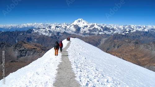 © nucharat, Obraz premium Hiking adventure on snowy mountain summit andes travel photography clear skies panoramic view