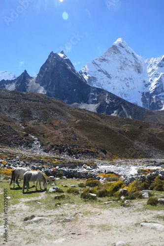 Fototapeta premium Hiking at the foot of Lhotse, Ama Dablam and Mount Everest in the Himalayan...