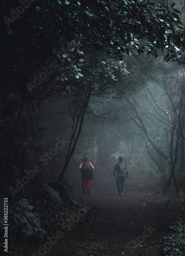 © Enric, Obraz premium Hiking in Misty Forest