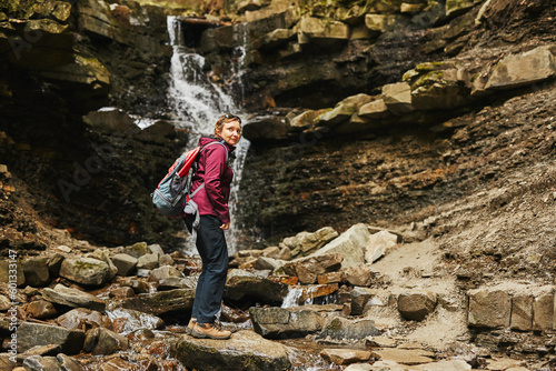 © Przemek Klos, Obraz premium Hiking in mountains. Woman enjoying hike on sunny vacation day. Female with backpack walking close to waterfall. Spending summer vacation close to nature