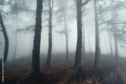 Obraz premium Hiking In the misty pine forest In the summer morning