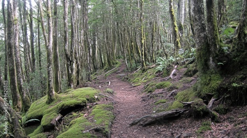 © Egriva, Fototapeta premium Hiking mossy forest trail, lush green canopy, mountain path, nature background, travel