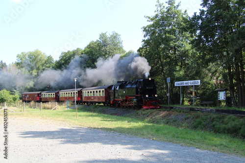Obraz premium Hiking on the Selketalstieg (Harz, Germany), Wandern auf dem Selketalstieg im Harz, steam train in Stolberg