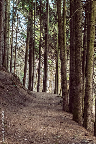 Obraz premium Hiking path in coniferous forest, Stiavnica Mountains, Slovakia