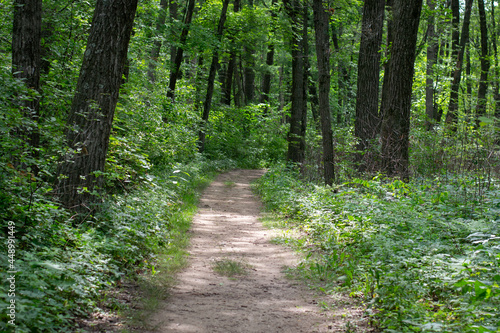 © dina, Obraz premium Hiking path in the woods with long trees and green leaves