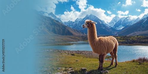 Fototapeta premium Hiking route through mountain landscape featuring wild camelids, suitable for nature exploration