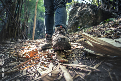 © surachat, Obraz premium Hiking shoes on road in the forest. travel concept.