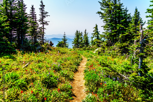 © hpbfotos, Fototapeta premium Hiking through alpine meadows with wild flowers on Juniper Ridge of Tod Mountain near the alpine village of Sun Peaks in the Shuswap Highlands of the central Okanagen in British Columbia, Canada