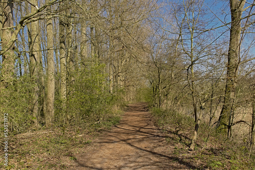 Fototapeta premium Hiking trail along meadows with bare trees and fresh green spring shrubs on a sunny day with clear blue sky in Scheldt valley near Ghent, Flanders, Belgium
