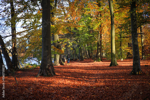 Fototapeta premium Hiking trail along the Werbellin lake in autumn in Federal State Brandenburg...