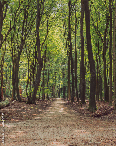 © ysbrandcosijn, Fototapeta premium Hiking trail between winding tree trunks in a deciduous forest during the summer.