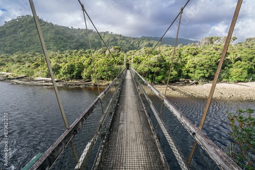© Zenstratus, Fototapeta premium Hiking trail bridge crossing the Kohaihai River on Heaphy Track, Karamea, West Coast, New Zealand.