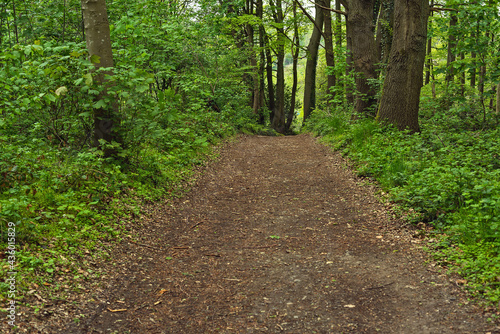 Fototapeta premium Hiking trail in a lush green sloping forest in the spring.