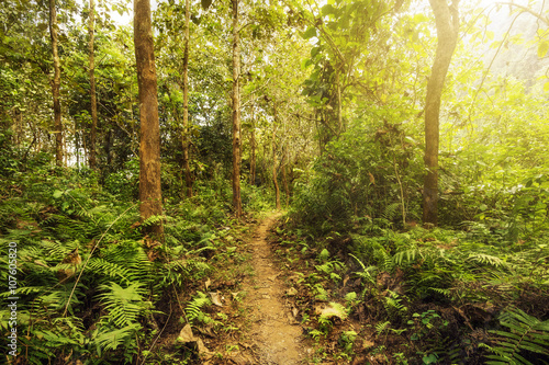 © R.M. Nunes, Obraz premium Hiking trail in lush green forest with sunlight shinning through the trees.
