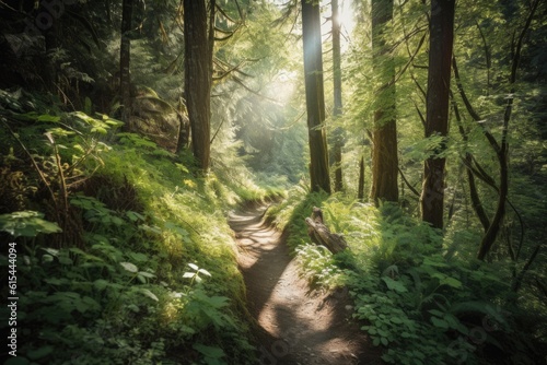 Obraz premium hiking trail leading through lush forest, with sunlight filtering through the...