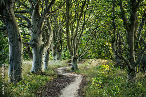 Naklejka premium Hiking trail leading through mystical beech forest on the German island Rügen...