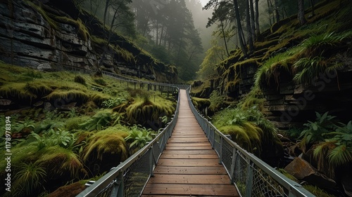 © Halim Karya Art, Obraz premium hiking trail,Suspended footbridge over mossy gorge connects hiking trails through cliffs.