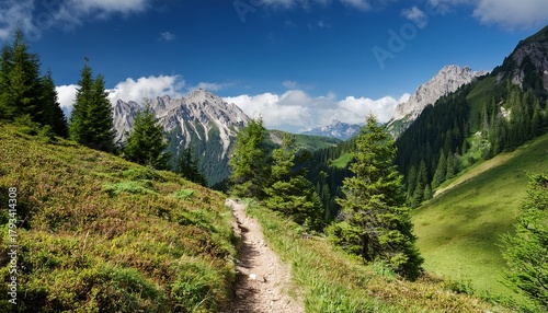 © Krystal, Naklejka premium hiking trail through forested alpine peaks
