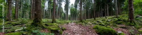 © Echt&KIreativ, Obraz premium Hiking trail through lush green forest covered with moss