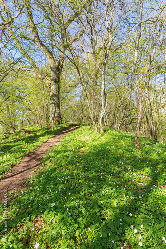 Obraz premium Hiking trail through the forest in spring with blooming wood anemones