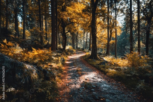 © SaroStock, Fototapeta premium Hiking trail winds through lush green forest at dawn in Bavarian Forest National Park, Germany, showcasing morning sunlight and colorful foliage