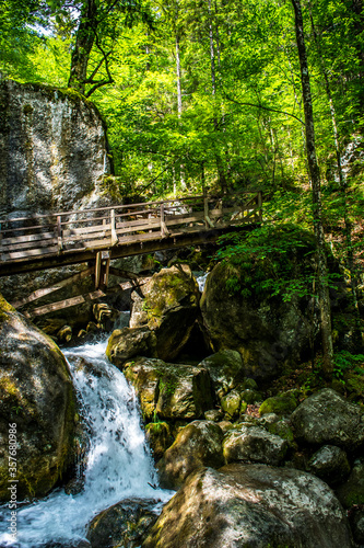 Fototapeta premium Hiking Trail With Wooden Bridge Over Waterfall Through Green Canyon At Myrafälle In Austria
