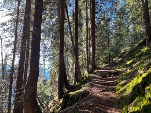 Obraz premium Hiking trails or mountaineering routes in the autumn Swiss Alpine environment...