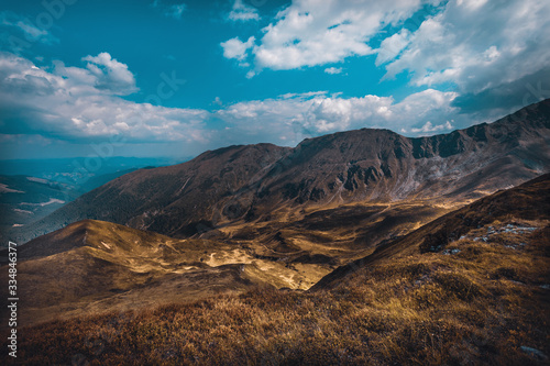 © bdavid32, Obraz premium Hiking trough epic mountain landscape with a big backpack, exploring and feeling the freedom of nature
