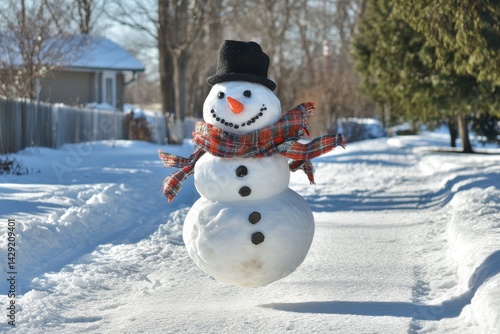 © Amena, Naklejka premium Hilarious snowman dashes through snow with scarf flying and hat bouncing in winter wonderland fun