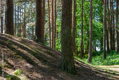 © Emils, Fototapeta premium hill in a pine forest on which black shadows fall from the sun shining through the pine trees