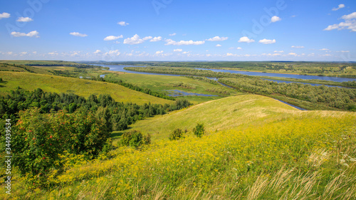 Naklejka premium hills overgrown with grass and trees on the banks of the Vyatka River