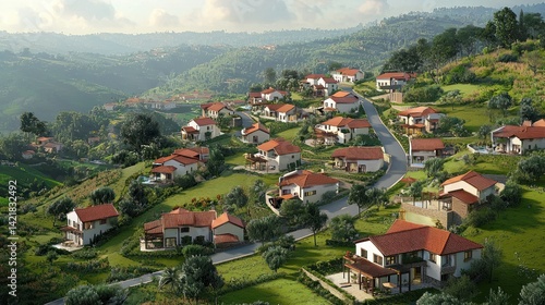 © ita, Fototapeta premium Hillside Haven: A Serene Village Nestled in Lush Greenery