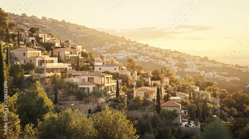 Fototapeta premium Hillside homes at sunset, Mediterranean village.
