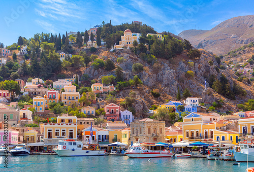 © Kavalenkava, Naklejka premium Hillside view of the colorful buildings and busy harbor on Symi Island, Greece.