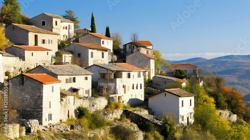 © Nadiyah, Obraz premium Hillside village autumnal landscape, houses nestled on slope, sunny day, panoramic view, ideal for travel brochure