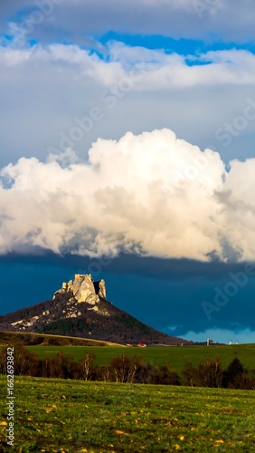 Naklejka premium Hilltop Castle Under Cloudy Sky