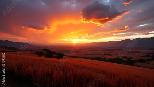 © destiny, Fototapeta premium Hilltop Sunset Over Valley with Dramatic Sky