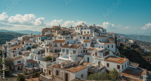 Fototapeta premium Hilltop townscape showcasing white homes under clear sky
