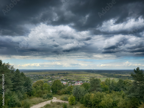 © zyoma_1986, Fototapeta premium Hilltop view of village under dramatic cloudy sky. Scenic panorama of countryside village before the rain