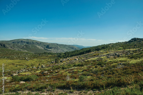 © Celli07, Naklejka premium Hilly landscape covered by green fields and rocks