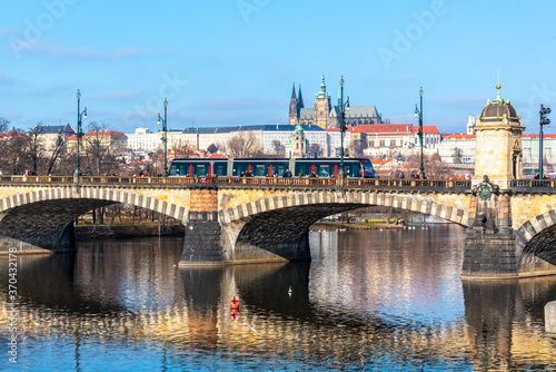 Fototapeta premium Hilly landscape on sunny and foggy day. Weather inversion. Jested - Kozakov...