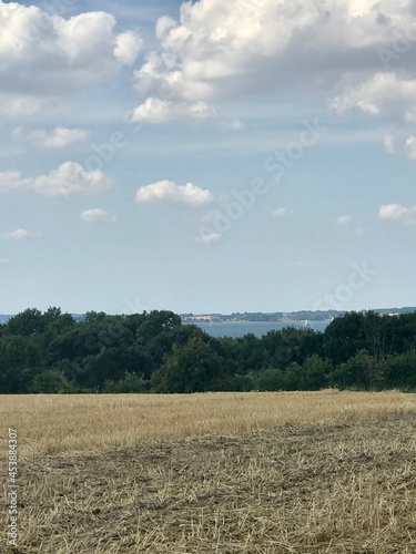 © Iva, Obraz premium Hilly scenic view on Baltic Sea from top rural crop field