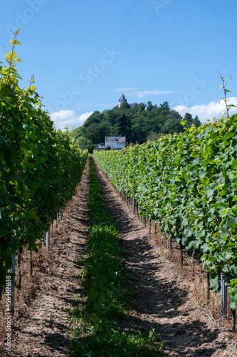© barmalini, Naklejka premium Hilly vineyards with white riesling grapes in Mosel river valley, Germany