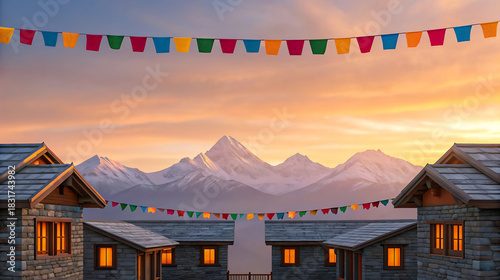 Naklejka premium Himalayan village rooftops at sunrise with colorful flags